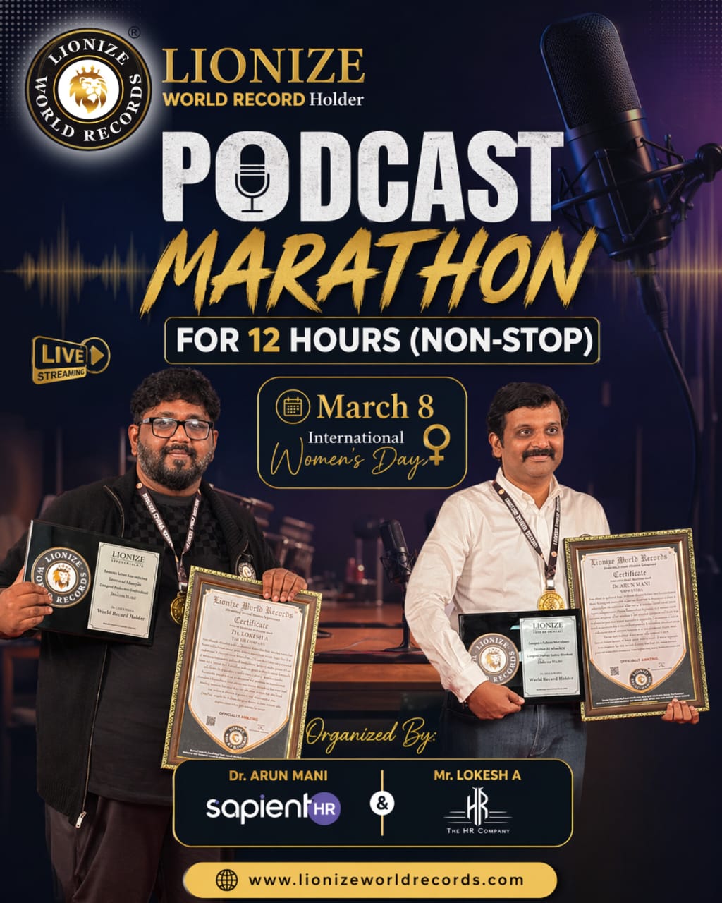 A 12-hour non-stop podcast marathon, organized by Dr. Arun Mani and Mr. Lokesh A, has now been officially recognized by Lionize World Records.
