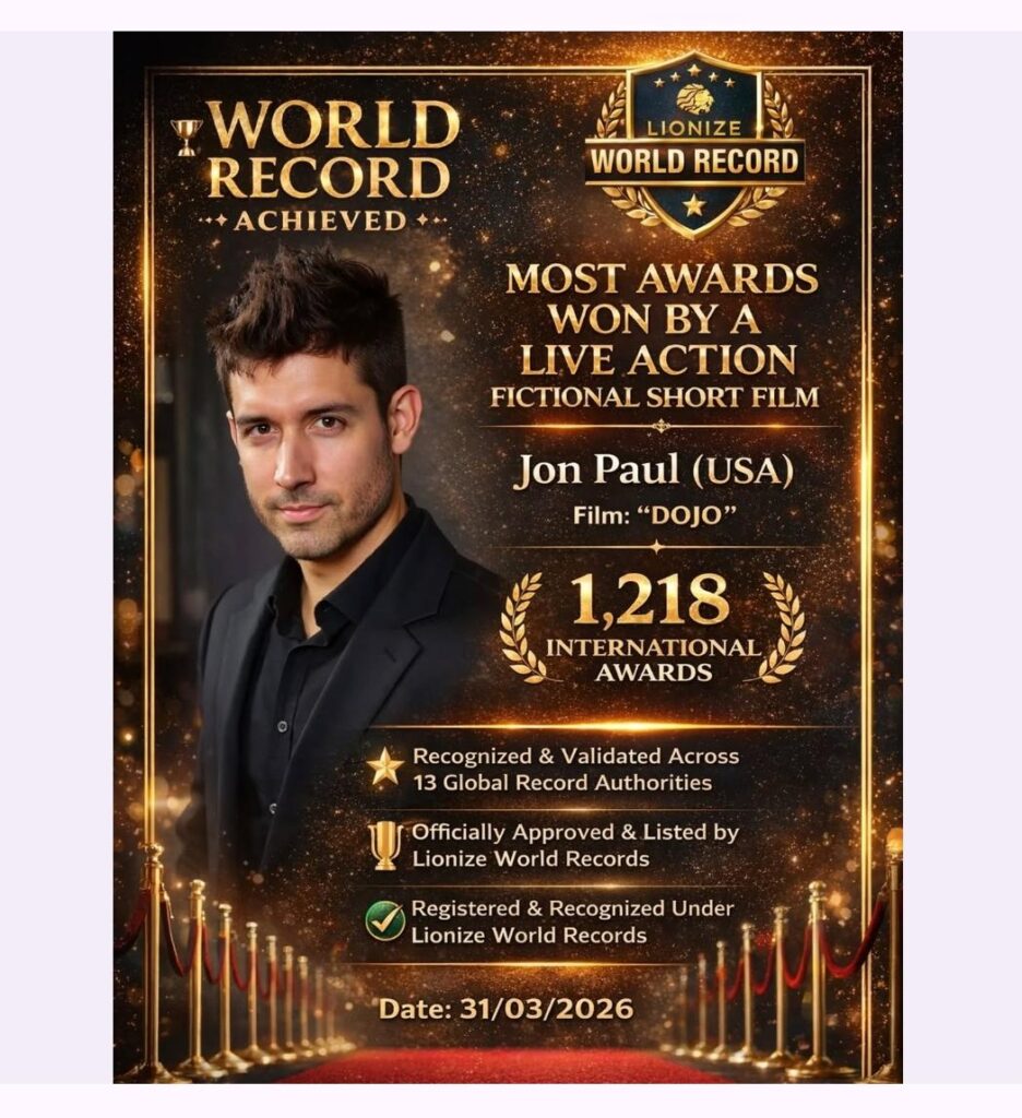 A remarkable milestone has been achieved in the world of cinema as Jon Paul (USA) sets a historic world record with his film “DOJO”, winning an astounding 1,218 international awards across the globe . This incredible achievement highlights the film’s excellence in storytelling, direction, and overall cinematic brilliance. Recognized by film festivals worldwide, “DOJO” stands as a symbol of dedication, creativity, and passion, setting a new benchmark in global filmmaking and inspiring creators everywhere to aim higher and dream bigger.